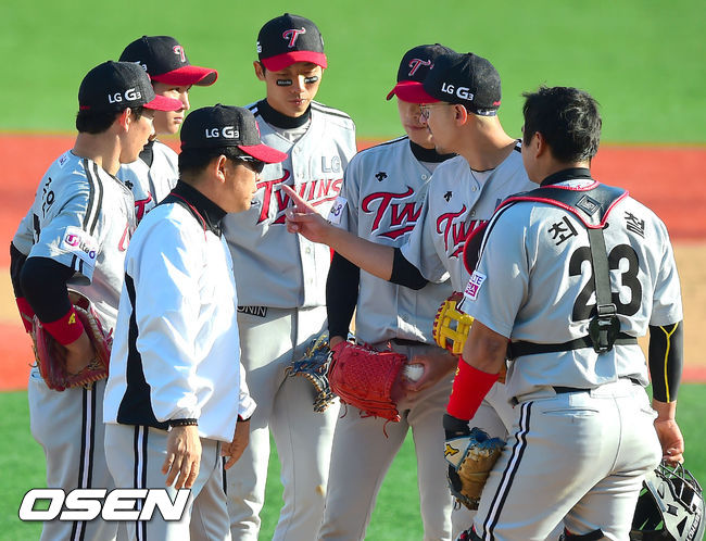 19일 오후 경남 창원 마산야구장에서 열린 2014 한국야쿠르트 세븐 프로야구 포스트시즌 준플레이오프 NC 다이노스와 LG 트윈스의 경기,5회말 무사 1,2루 LG 양상문 감독이 마운드에 올라 선수들과 이야기를 나누고 있다
