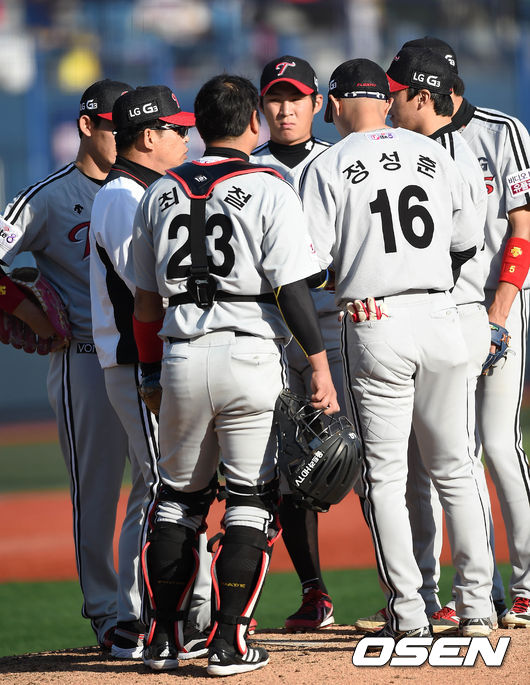 5회말 1사 1,2루에서 마운드를 방문한 LG 양상문 감독이 선수들과 이야기를 나누고 있다.