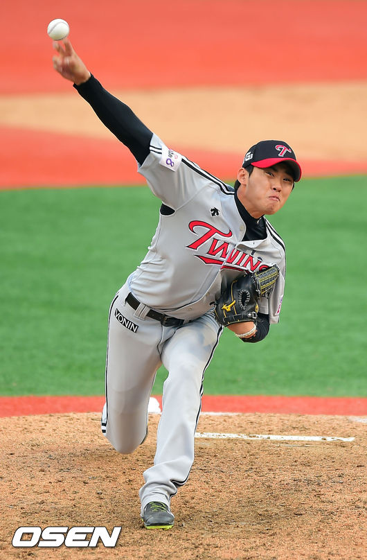 19일 오후 경남 창원 마산야구장에서 열린 2014 한국야쿠르트 세븐 프로야구 포스트시즌 준플레이오프 NC 다이노스와 LG 트윈스의 경기,7회말 LG 임정우가 역투하고 있다.