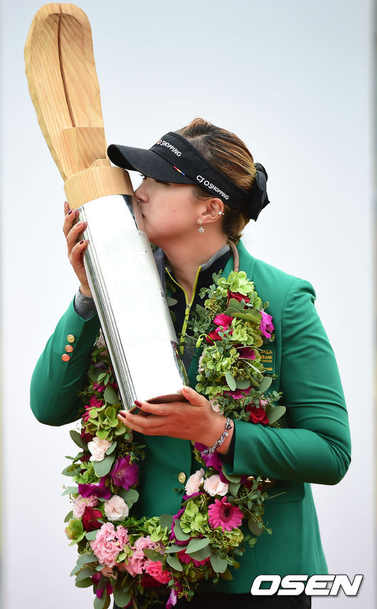 '슈퍼 루키' 백규정이 미국여자프로골프(LPGA) 투어 첫 출전에서 생애 첫 우승을 차지하는 기쁨을 맛봤다. 올시즌 한국여자프로골프(KLPGA) 투어에서 3승을 거둔 백규정은 19일 인천 스카이72 골프장 오션코스(파72·6364야드)에서 열린 하나외환 LPGA 챔피언십 최종 4라운드에서 합계 10언더파 278타를 쳐 전인지(20·하이트진로), 브리트니 린시컴(미국)과 연장전에 들어간 뒤 우승을 거머쥐었다. 우승을 거둔 백규정이 트로피에 키스를 하고 있다. / youngrae@osen.co.kr
