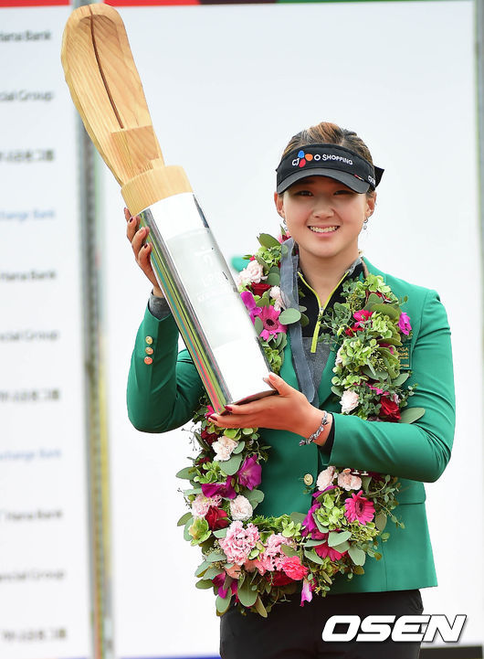 연장 18번홀에서 버디 퍼팅을 성공시켜 우승을 차지한 백규정이 우승 트로피를 들고 환하게 웃고 있다. / youngrae@osen.co.kr