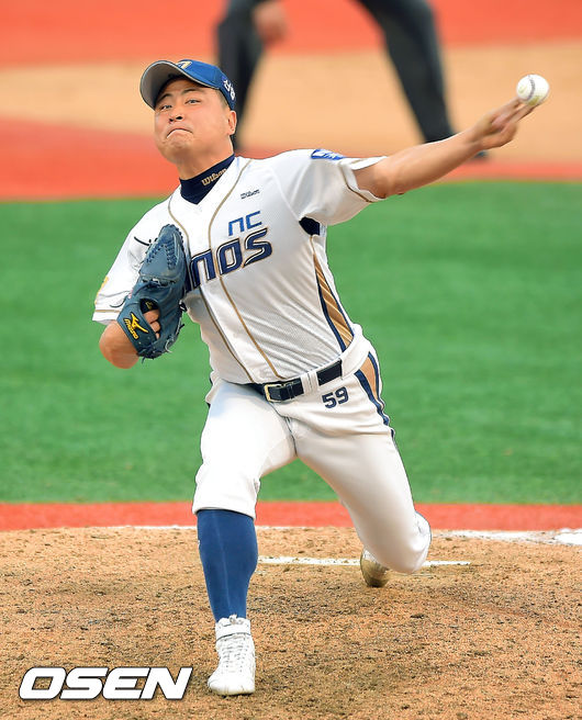 19일 오후 경남 창원 마산야구장에서 열린 2014 한국야쿠르트 세븐 프로야구 포스트시즌 준플레이오프 NC 다이노스와 LG 트윈스의 경기,8회초 NC 이혜천 투수가 역투하고 있다.