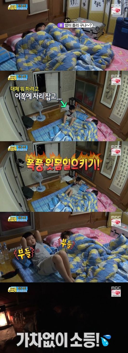 윤후가 잠들기 전 폭풍 윗몸 일으키기를 선보이며 '상남자'로서의 매력을 뽐냈다.