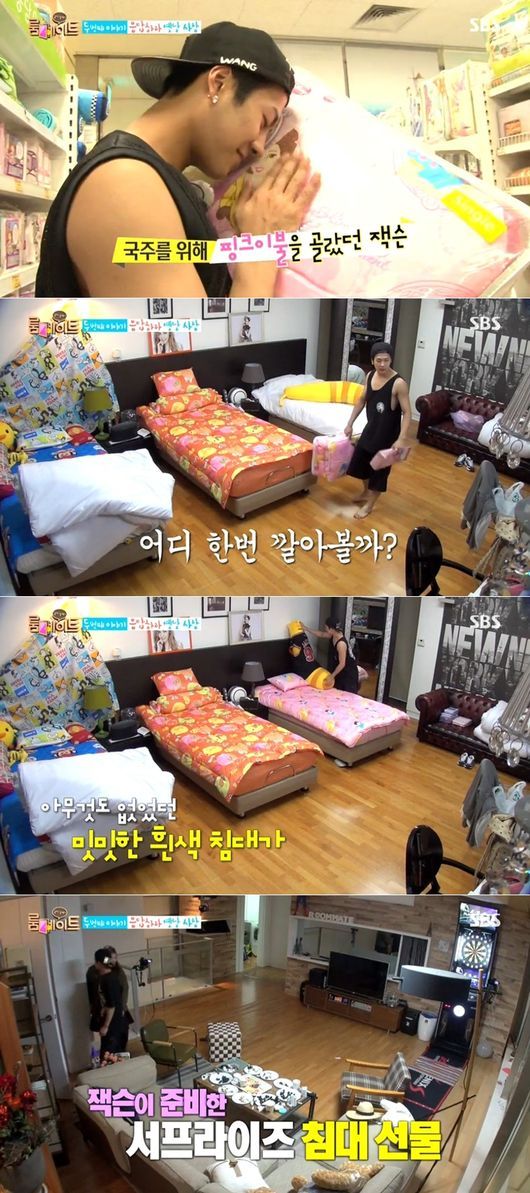 잭슨은 19일 오후 방송된 SBS 예능프로그램 ‘일요일이 좋다-룸메이트 시즌2(이하 룸메이트)’에서 앞서 준비한 이불과 침대보를 이국주 몰래 그의 침대 위에 가져다 놨다.