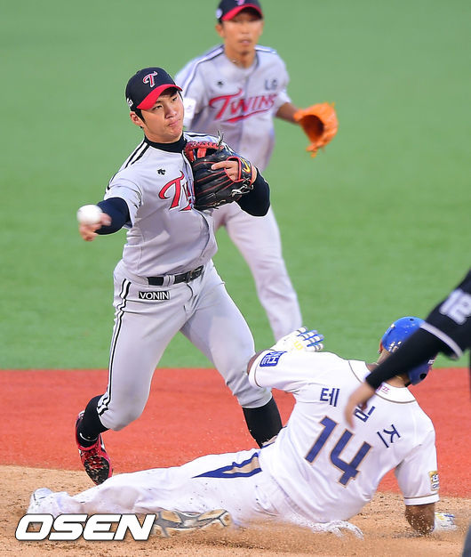 19일 오후 경남 창원 마산야구장에서 열린 2014 한국야쿠르트 세븐 프로야구 포스트시즌 준플레이오프 NC 다이노스와 LG 트윈스의 경기,8회말 1사 1,2루 NC 나성범의 병살타때 LG 오지환 유격수가 1루 주자 테임즈를 포스아웃 시킨뒤 1루로 송구하고 있다