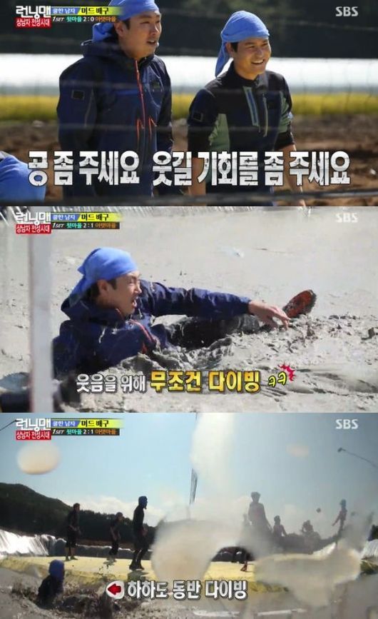 조진웅은 19일 오후 방송된 SBS 예능프로그램 '일요일이 좋다-런닝맨'에서 머드배구를 하던 중 일부러 머드에 힘껏 몸을 던져 웃음을 자아냈다.
