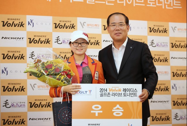 2014 볼빅 LGLT 10월 대회에서 우승한 올시즌 최연소 우승자 김영현이 볼빅 이상희 사장과 기념 촬영을 하고 있다