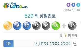 제620회 나눔로또 추첨이 지난 18일 실시됐다. 나눔로또에서 발표한 로또 620회 당첨번호는 2, 16, 17, 32, 39, 45, 보너스 40이다. 6개 번호가 일치한 로또 1등 당첨자는 총 7명으로 각 2,028,283,233원을 받는다. 1등 번호 5개와 보너스 번호가 일치한 2등 당첨자는 총 44명으로 각 53,780,238원을 받는다.