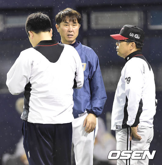 20일 오후 경남 창원 마산야구장에서 2014 한국야쿠르트 세븐 프로야구 포스트시즌 준플레이오프 2차전 NC 다이노스와 LG 트윈스의 경기, 경기시작전 LG 양상문 감독이 이야기를 나누고 있다.