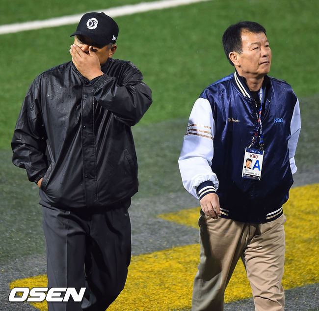 20일 오후 경남 창원 마산야구장에서 열린 2014 한국야쿠르트 세븐 프로야구 포스트시즌 준플레이오프 2차전 NC 다이노스와 LG 트윈스의 경기에 앞서 계속되는 비에 KBO 관계자들이 난해한 표정을 짓고 있다.