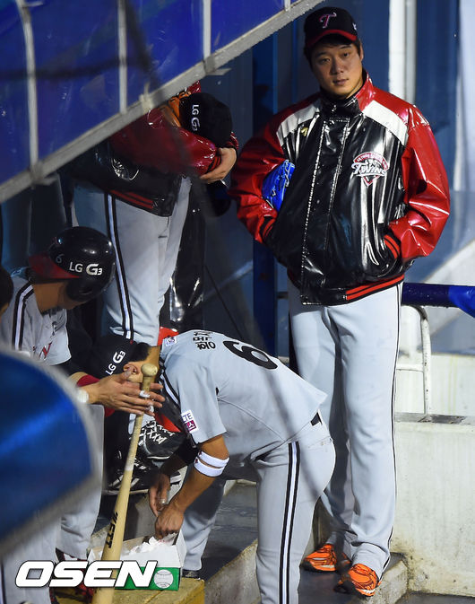 20일 오후 경남 창원 마산야구장에서 열린 2014 한국야쿠르트 세븐 프로야구 포스트시즌 준플레이오프 2차전 NC 다이노스와 LG 트윈스의 경기에 앞서 LG 류제국이 계속되는 비에 더그아웃에서 대기하고 있다.