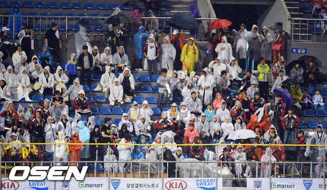 20일 오후 경남 창원 마산야구장에서 열린 2014 한국야쿠르트 세븐 프로야구 포스트시즌 준플레이오프 2차전 NC 다이노스와 LG 트윈스의 경기에 앞서 계속되는 강우에 LG 팬들이 우의를 입은채 경기시작을 기다리고 있다