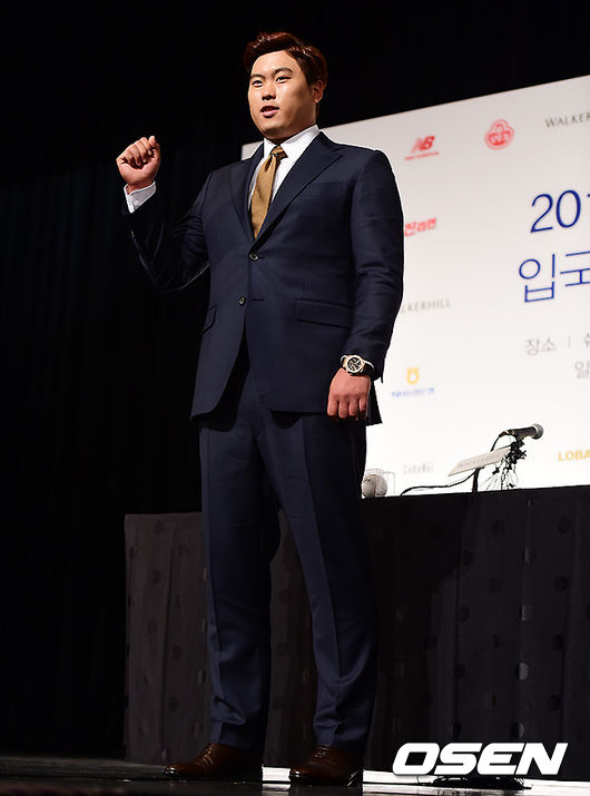 류현진이 기자회견을 마치고 포토타임을 하고 있다.