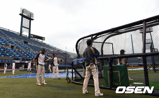 비가 내리는 가운데 NC 선수들이 타격 훈련을 하고 있다.