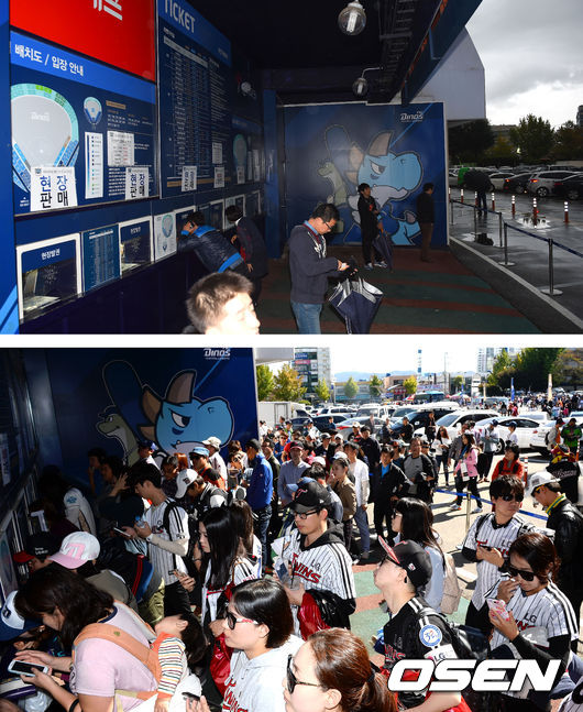 21일 오후 경남 창원 마산야구장에서 열린 2014 한국야쿠르트 세븐 프로야구 포스트시즌 준플레이오프 2차전 NC 다이노스와 LG 트윈스의 경기에 앞서 계속되는 강우에 텅빈 현장매표소 앞(위), 아래는 19일 준플레이오프 1차전이 열렸던 현장매표소