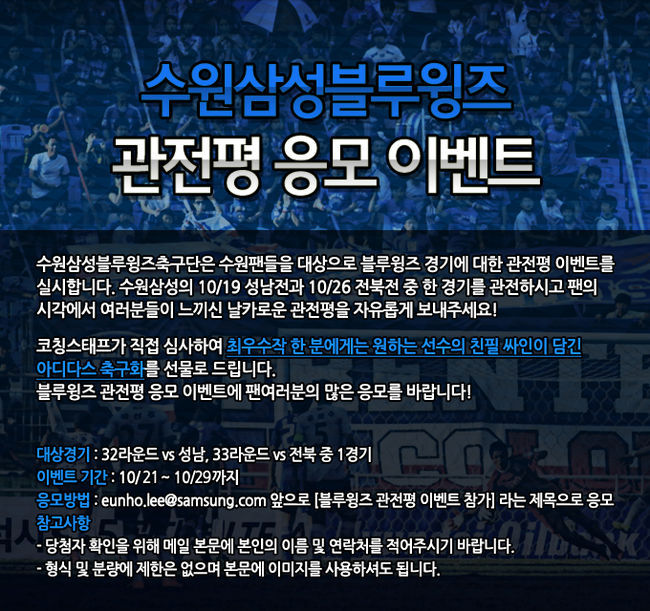 수원 삼성 블루윙즈 축구단이 팬들을 대상으로 블루윙즈 경기에 대한 관전평 이벤트를 실시한다.