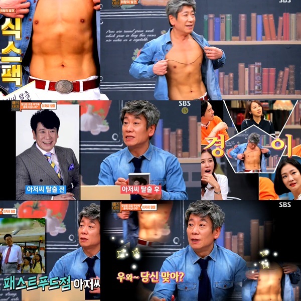 몸매가 슬림 해진 것은 물론 스타일까지 젊어진 김명국은 방송이 시작한지 얼마 지나지 않아 자신의 탄탄한 식스팩을 공개하려고 셔츠까지 벗었다. 김명국은 “‘매직아이’를 위해 격하게 운동했다. 이틀 동안 물을 안 먹었다”고 말하고는 복근을 공개, 52세라고는 믿기 힘들 만큼의 식스팩을 과시해 놀라움을 자아냈다.