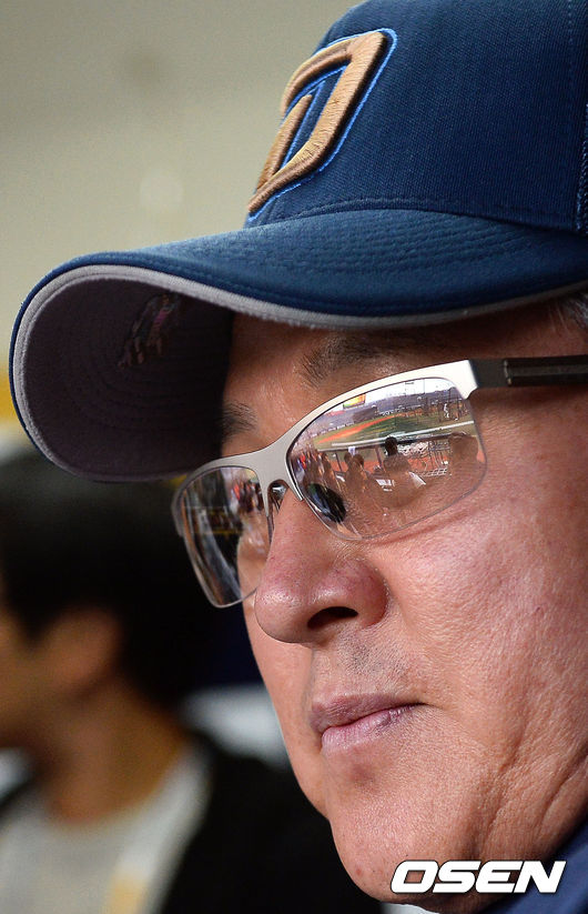 22일 오후 경남 창원 마산야구장에서 열린 2014 한국야쿠르트 세븐 프로야구 포스트시즌 준플레이오프 2차전 NC 다이노스와 LG 트윈스의 경기에 앞서 NC 김경문 감독이 선수들의 훈련을 지켜보고 있다.