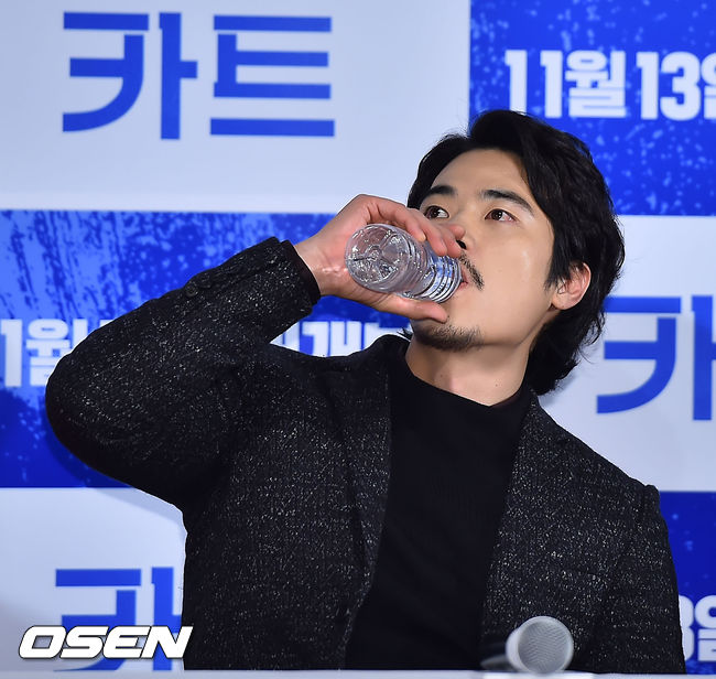 22일 오후 서울 건대입구 롯데시네마 건대입구에서 열린 영화 '카트' 언론배급시사회에서 김강우가 물을 마시고 있다.