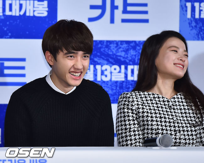22일 오후 서울 건대입구 롯데시네마 건대입구에서 열린 영화 '카트'(부지영 감독)언론배급시사회에서 도경수(엑소 디오)가 김영애의 칭찬을 받고 쑥스러워하고 있다.