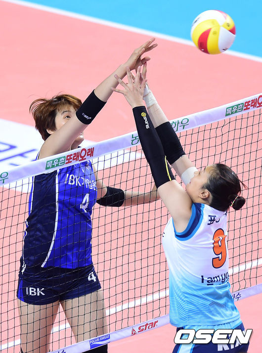 22일 오후 경기도 화성시 화성종합경기타운 실내체육관에서 열린 '2014-2015 NH농협 V-리그' 여자부 IBK기업은행과 GS칼텍스의 경기 1세트 김희진이 공격을 시도하고 있다.