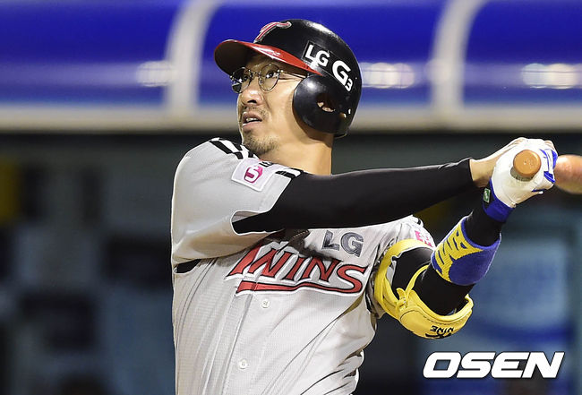 22일 오후 경남 창원 마산야구장에서 열린 2014 한국야쿠르트 세븐 프로야구 포스트시즌 준플레이오프 2차전 NC 다이노스와 LG 트윈스 경기, 1회초 LG 선두타자 정성훈이 솔로홈런을 치고 있다.