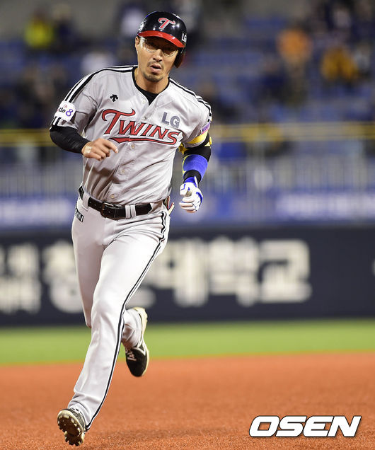 22일 오후 경남 창원 마산야구장에서 열린 2014 한국야쿠르트 세븐 프로야구 포스트시즌 준플레이오프 2차전 NC 다이노스와 LG 트윈스 경기, 1회초 LG 선두타자 정성훈이 솔로홈런을 치고 주루하고 있다.