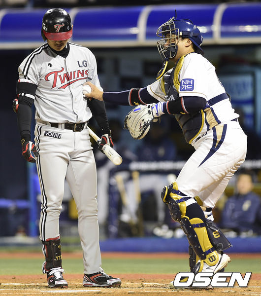 22일 오후 경남 창원 마산야구장에서 열린 2014 한국야쿠르트 세븐 프로야구 포스트시즌 준플레이오프 2차전 NC 다이노스와 LG 트윈스 경기, 1회초 1사 주자 없는 상황 LG 박용택이 낫아웃 상황에서 김태군에게 태그당하고 있다.