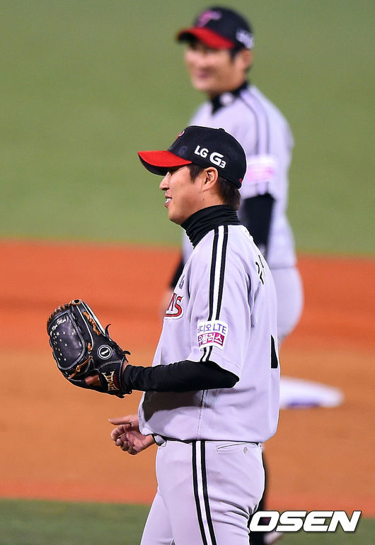 22일 오후 경남 창원 마산야구장에서 열린 2014 한국야쿠르트 세븐 프로야구 포스트시즌 준플레이오프 2차전 NC 다이노스와 LG 트윈스의 경기, 1회말 무사 1루 NC 김종호를 병살플레이로 위기 넘긴 LG 선발투수 우규민이 미소 짓고 있다.