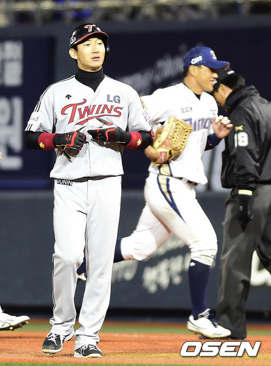 22일 오후 경남 창원 마산야구장에서 열린 2014 한국야쿠르트 세븐 프로야구 포스트시즌 준플레이오프 2차전 NC 다이노스와 LG 트윈스 경기, 2회초 2사 주자 1,2루 LG 손주인의 안타성 타구가 NC 이종욱의 호수비에 아웃처리 되자 아쉬운 표정을 짓고 있다.