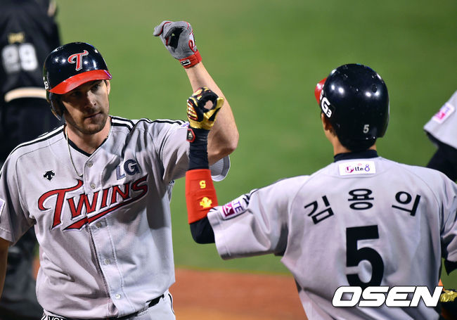 22일 오후 경남 창원 마산야구장에서 열린 2014 한국야쿠르트 세븐 프로야구 포스트시즌 준플레이오프 2차전 NC 다이노스와 LG 트윈스의 경기, 4회초 1사 1루 LG 스나이더가 2점홈런을 날린후 동료들과 하이파이브를 하고 있다