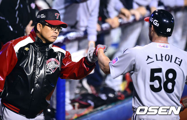 22일 오후 경남 창원 마산야구장에서 열린 2014 한국야쿠르트 세븐 프로야구 포스트시즌 준플레이오프 2차전 NC 다이노스와 LG 트윈스의 경기, 4회초 1사 1루 LG 스나이더가 2점홈런을 날린후 양상문 감독과 하이파이브를 하고 있다