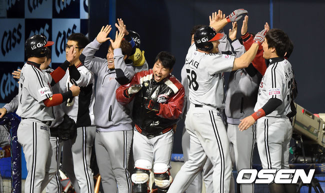 4회초 1사 1루에서 LG 스나이더가 중월 투런 홈런을 치고 더그아웃에서 동료들과 환호하고 있다.