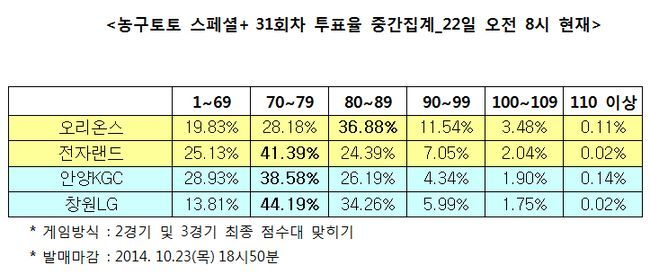 투표율을 살펴보면, 오리온스는 80~89점대가 36.88%로 1순위를 차지했고, 전자랜드는 이보다 낮은 70~79점(41.39%)를 기록했다.