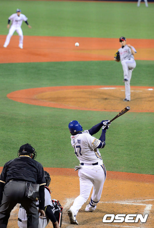 22일 오후 경남 창원 마산야구장에서 열린 2014 한국야쿠르트 세븐 프로야구 포스트시즌 준플레이오프 2차전 NC 다이노스와 LG 트윈스의 경기, 6회말 2사 1,2루 NC 나성범이 외야플라이 타구를 날리고 있다.