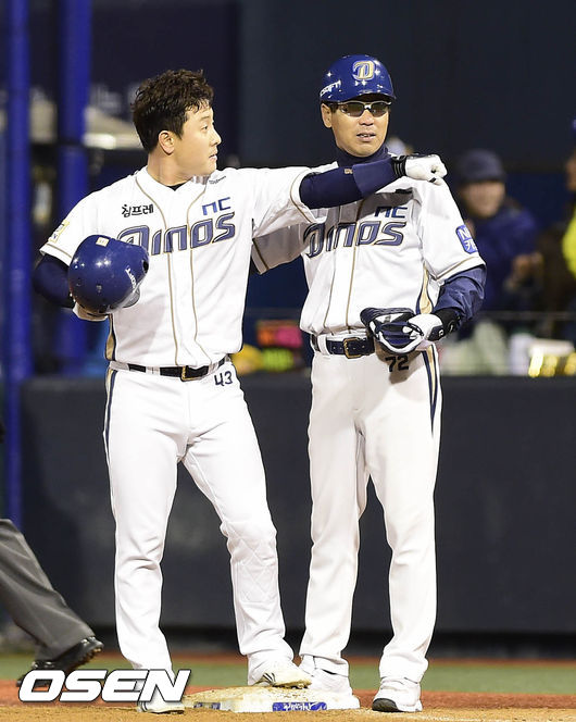 22일 오후 경남 창원 마산야구장에서 열린 2014 한국야쿠르트 세븐 프로야구 포스트시즌 준플레이오프 2차전 NC 다이노스와 LG 트윈스 경기, 7회말 2사 주자 1,2루 NC 이태원이 1타점 적시타를 치고 더그아웃을 향해 세리머니를 하고 있다.