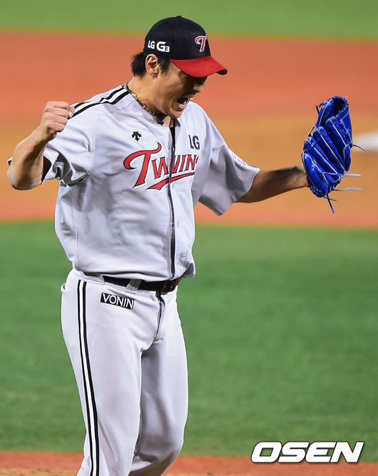 22일 오후 경남 창원 마산야구장에서 열린 2014 한국야쿠르트 세븐 프로야구 포스트시즌 준플레이오프 2차전 NC 다이노스와 LG 트윈스의 경기, 7회말 2사 1,3루 NC 박민우를 삼진아웃 잡은 LG 이동현 투수가 환호하고 있다.
