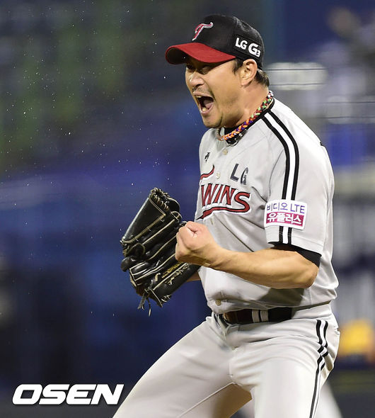 22일 오후 경남 창원 마산야구장에서 열린 2014 한국야쿠르트 세븐 프로야구 포스트시즌 준플레이오프 2차전 NC 다이노스와 LG 트윈스 경기, 9회말 LG 봉중근이 승리를 지켜낸뒤 환호하고 있다.