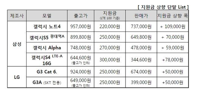 또한 SK텔레콤은 23일부터 갤럭시 노트 4 지원금을 최대 22만(기존대비10.9만원 상향)으로 상향키로 했다. 또한 시장에서 관심이 높은 갤럭시S5광대역 LTE-A, G3 Cat 6 등 5종의 최신 단말 최대 지원금도 약 5~8만원 상향키로 했다. 제조사와 협의를 통해 고객들이 많이 찾는 갤럭시S4 LTE-A 16G, LG G3A 등 3개 기종의 출고가도 약 5.5~7만원 인하하는 등 고객의 단말 구매부담 경감을 위한 방안도 시행한다.