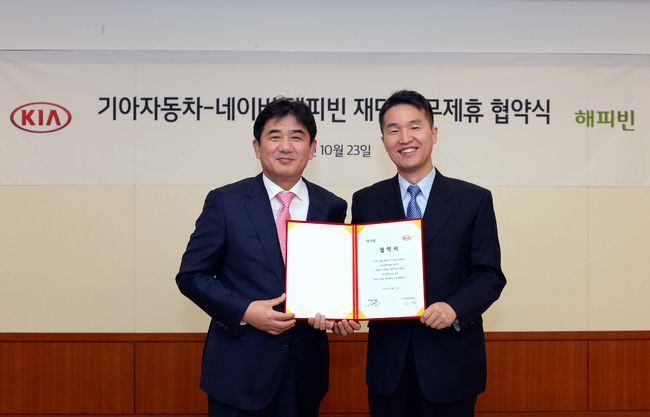 기아자동차는 네이버 기부포털 해피빈과 23일 서울 서초구 기아차 본사에서 기아차 김견 전무와 네이버 해피빈 권혁일 대표 등 관계자들이 참석한 가운데 나눔문화 확산을 위한 ‘카네이션(Car-Donation)’ 캠페인 관련 업무 협약(MOU)을 맺었다.