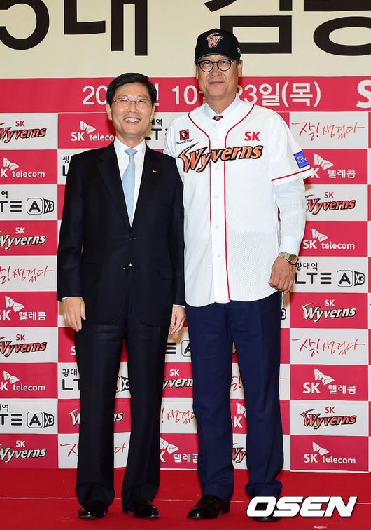 23일 오후 인천 송도컨벤시아에서 열린 SK 와이번스 감독 이취임식에서 김용희 신임감독이 임원일 대표와 기념촬영을 하고 있다.