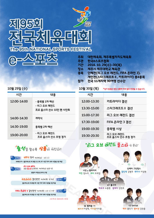 오는 29일 오후 1시와 30일 오후 2시에 진행되는 LoL 선수 팬사인회에는 ‘앰비션’ 강찬용, ‘매드라이프’ 홍민기(이상 CJ), ‘페이커’ 이상혁, ‘이지훈’ 이지훈(이상 SKT), ‘썸데이’ 김찬호, ‘애로우’ 노동현(이상 KT), ‘와치’ 조재걸, ‘카인’ 장누리(이상 나진), ‘캡틴잭’ 강형우, ‘체이서’ 이상현(이상 진에어) 등 10명이 참여한다. 이벤트 경기는 전국체육대회 정식경기가 종료 된 후 29일, 30일 양일 저녁 7시부터 열린다.