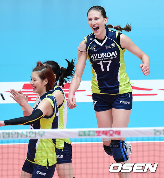 23일 오후 경기도 성남시 성남실내체육관에서 열린 '2014-2015 NH농협 V-리그' 현대건설과 흥국생명의 경기 1세트 현대건설 선수들이 득점 후 기뻐하고 있다.