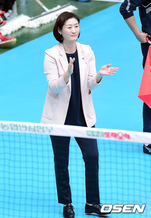 23일 오후 경기도 성남시 성남실내체육관에서 열린 '2014-2015 NH농협 V-리그' 현대건설과 흥국생명의 경기 2세트 흥국생명 박미희 감독이 선수들에게 박수를 보내고 있다.