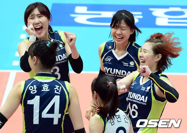 23일 오후 경기도 성남시 성남실내체육관에서 열린 '2014-2015 NH농협 V-리그' 현대건설과 흥국생명의 경기 4세트 현대건설 선수들이 득점 후 기뻐하고 있다.