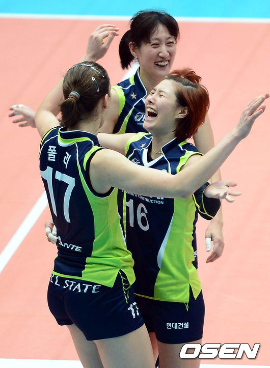 23일 오후 경기도 성남시 성남실내체육관에서 열린 '2014-2015 NH농협 V-리그' 현대건설과 흥국생명의 경기 종료 후 김주하와 폴리가 승리의 기쁨을 나누고 있다.