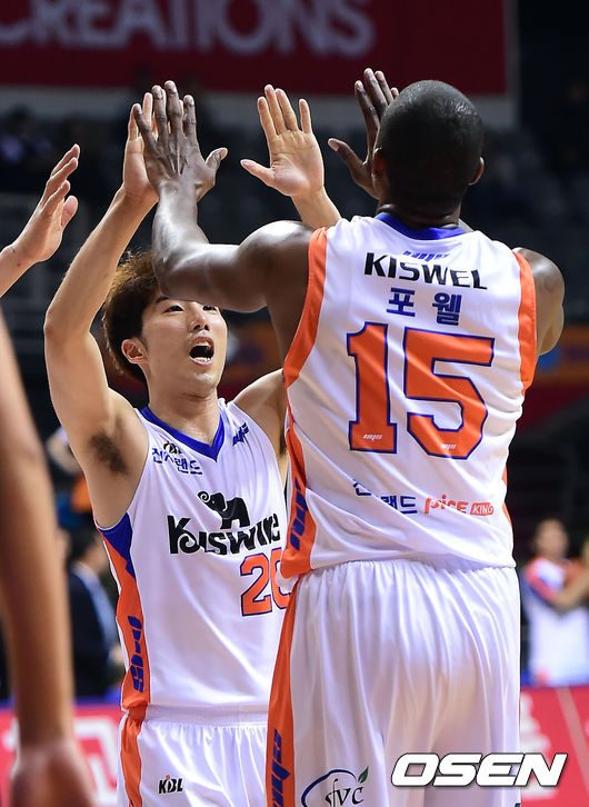 23일 오후 경기도 고양실내체육관에서 '2014-2015 KCC 프로농구' 오리온스-전자랜드 경기가 열렸다. 오리온스는 개막 후 5경기 동안 한 번도 패하지 않고 5연승을 기록하며 10개 구단 중 유일하게 패배가 없는 팀이다. 전자랜드도 3승 1패로 오리온스에 이어 2위를 기록중이다. 1쿼터 전자랜드 정재홍이 바스켓 카운트를 얻어낸 포웰과 기뻐하고 있다. / youngrae@osen.co.kr