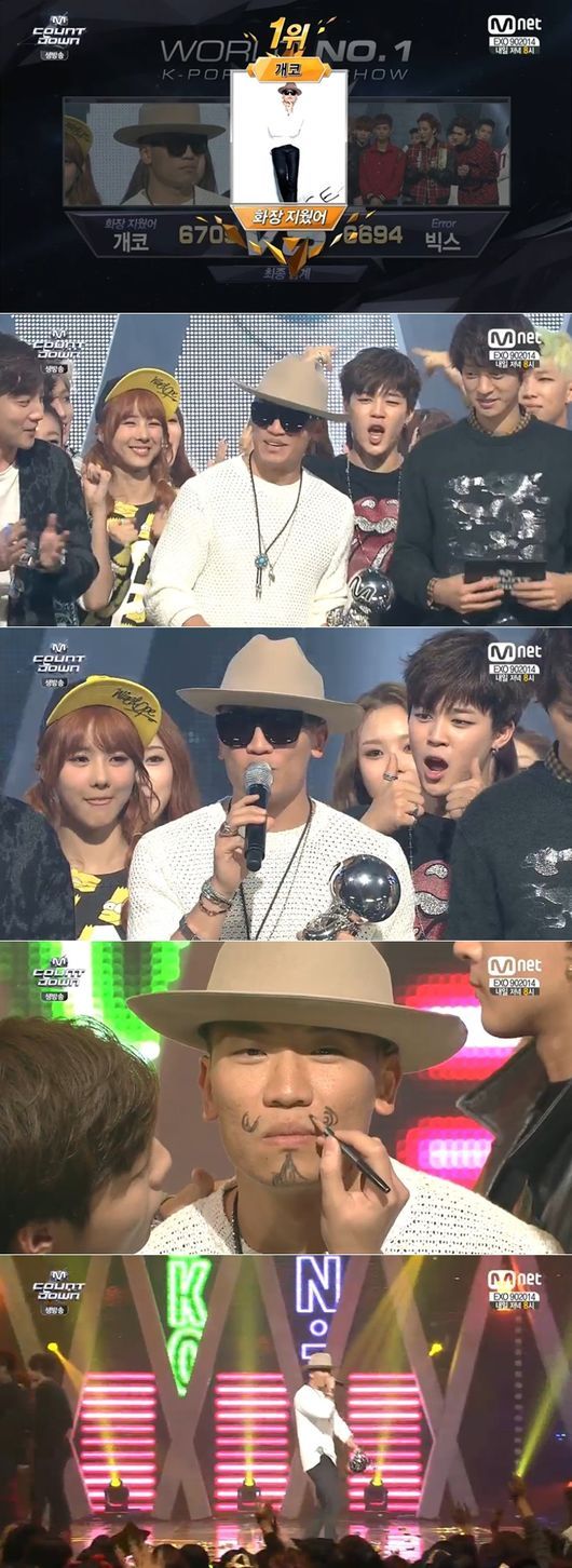 개코는 23일 오후 방송된 엠넷 ‘엠카운트다운’에서 첫 솔로앨범 더블타이틀곡 ‘화장 지웠어’로 빅스의 ‘에러(Error)’를 꺾고 1위 트로피를 거머쥐었다.