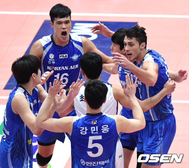 23일 오후 경기도 성남시 성남실내체육관에서 열린 '2014-2015 NH농협 V-리그' 한국전력과 대한항공의 경기 1세트 대한항공 선수들이 득점 후 기뻐하고 있다.