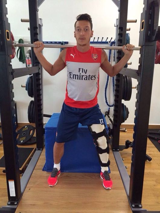 외질은 사진도 함께 공개했다. 체육관에서 왼쪽 다리에 보조기를 착용한 외질은 바벨을 든 채 카메라를 응시하고 있다.
